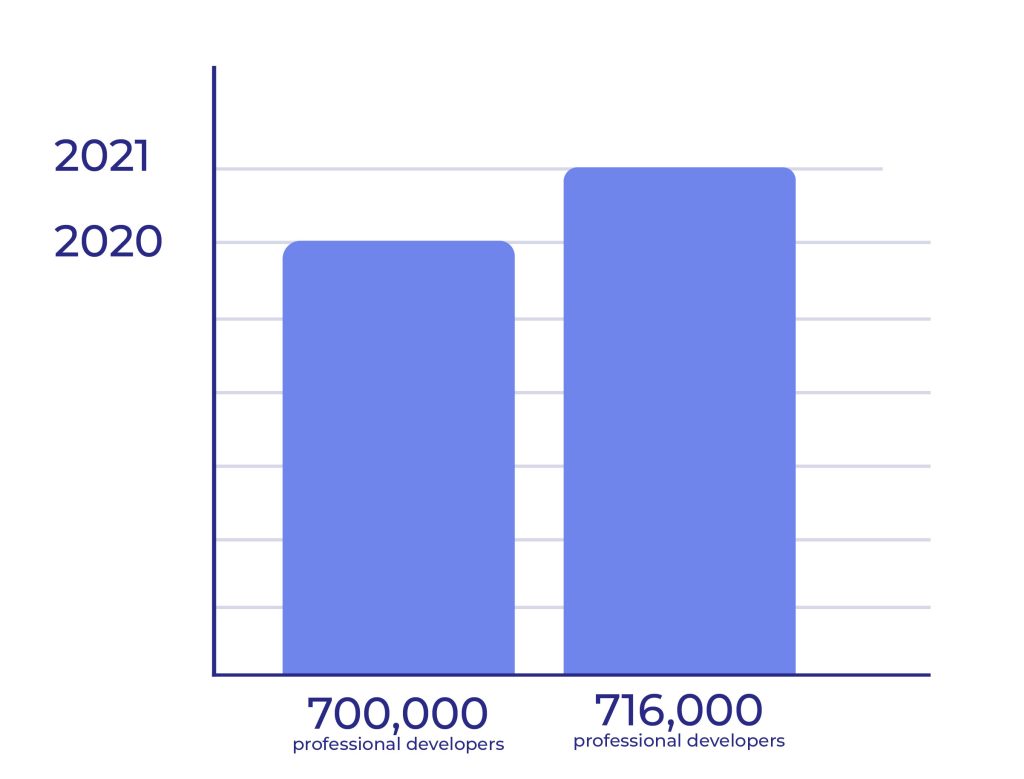 Nigeria emerged as a hotspot for developer talent in 2021. The country continues to transform its digital landscape, unlocking more opportunities for IT professionals who specialise mainly in front-end, back-end and full-stack web development. As of 2021, there are currently 114,536 developers in the country, which is 556 IT talents per million population (Ernesto Spruyt, 2021). Nigerian professionals are pioneering API-based financial services and open banking, which has led to a fintech boom across the region. Lagos, Nigeria’s capital and Africa’s largest city, dubbed “Africa’s Silicon Valley”, is home to large tech communities, such as in the Yaba district. According to the 2019 Partech Report, Fintech and EdTech account for the majority of the country’s technology growth. The technology sector contributed 15% to Nigeria’s GDP growth in 2020, second only to agriculture. Nigeria also has the largest population of English speakers in Africa (over 79 million).