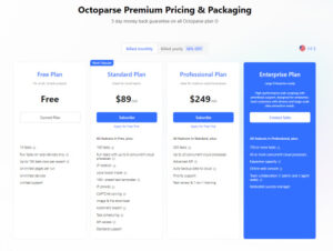 Octoparse offers a range of pricing options to accommodate different needs, including a free tier with basic functionality. The Standard Plan is great for small teams at $75/month, offering features such as 100 tasks, IP rotation, CAPTCHA solving, and more. The Professional Plan, ideal for medium-sized businesses, is priced at $208/month and includes up to 250 tasks, advanced API access, and priority support among others.
